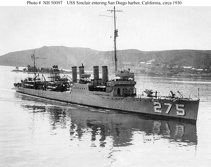 116k | USS Sinclair (DD-275) Entering San Diego harbor, California, circa 1930. Ballast Point is in the left background. U.S. Naval Historical Center Photograph. | Fred Weiss |