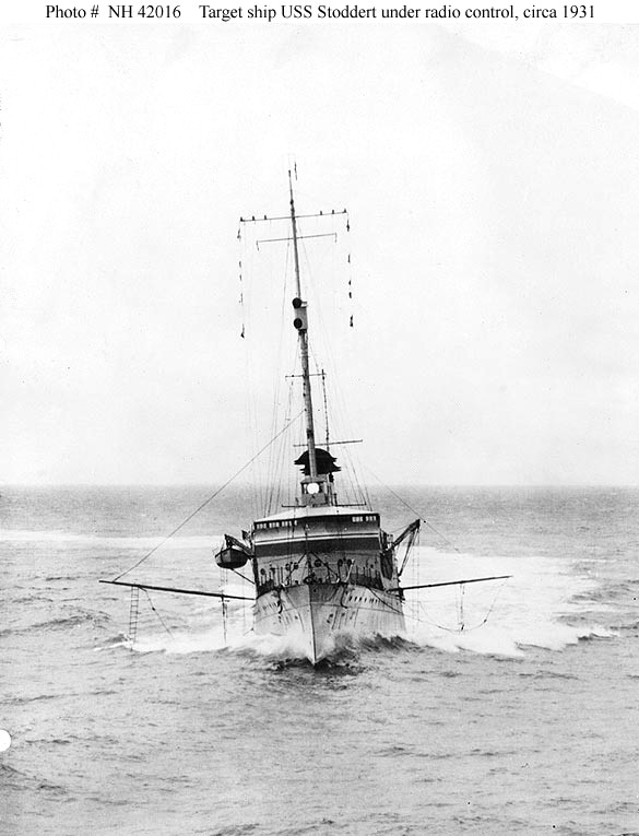 | 82k | USS Stoddert (DD-302) steaming under radio-control, circa 1931, while she was serving as a radio-controlled target. Note the boat booms serving as outriggers on both sides of the ship. U.S. Naval Historical Center Photograph. | Fred Weiss |