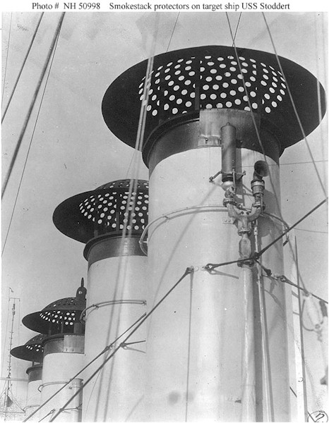 | 82k | USS Stoddert (DD-302) view of the ship's smokestacks, circa 1931, showing the steel "umbrellas" installed to protect them from falling bombs. Stoddert was then serving as a radio-controlled target ship. Note the steam whistle on the forward stack, and smokestack guy wires. U.S. Naval Historical Center Photograph. | Paul Rebold |