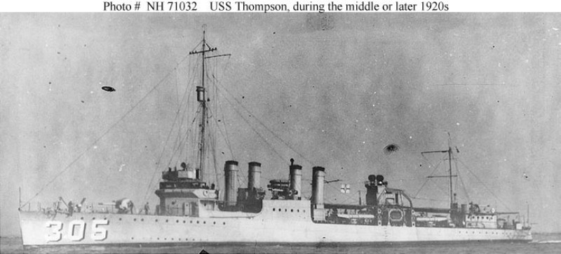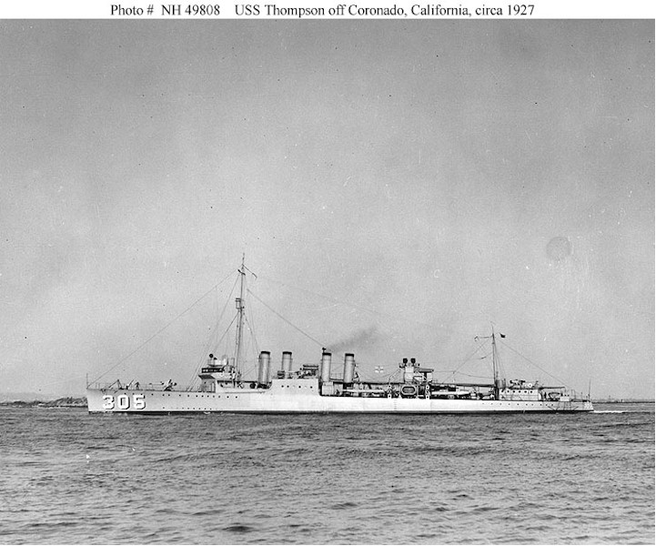 | 89k | Photo #: NH 49808: USS Thompson (DD-305) steaming off Coronado, California, circa 1927, while serving with Destroyer Division 32, Destroyer Squadron 11, Battle Fleet. Note the Short Range Battle Practice target rigged between her after smokestack and searchlight platform. U.S. Naval Historical Center Photograph. | Fabio Peņa |