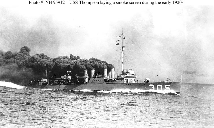 | 78k | Photo #: NH 95912: USS Thompson (DD-305) laying a smoke screen during exercises, circa 1920-1921. Photographed by O.W. Waterman. Note that the ship's guns, torpedo tubes and rangefinder are manned and