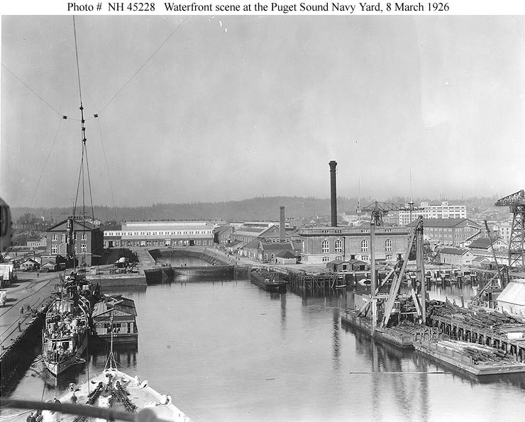 | 112k | Puget Sound Navy Yard, Bremerton, Washington View of part of the Yard's waterfront, 8 March 1926. USS Thompson (DD-305) is tied up to the pier at left, with a work float alongside her. USS Holland (AS-3) -- barely visible -- is under construction in the drydock in the right background. Note civilian barges at work on a pier in the right foreground. U.S. Naval Historical Center Photograph. | Fred Weiss |