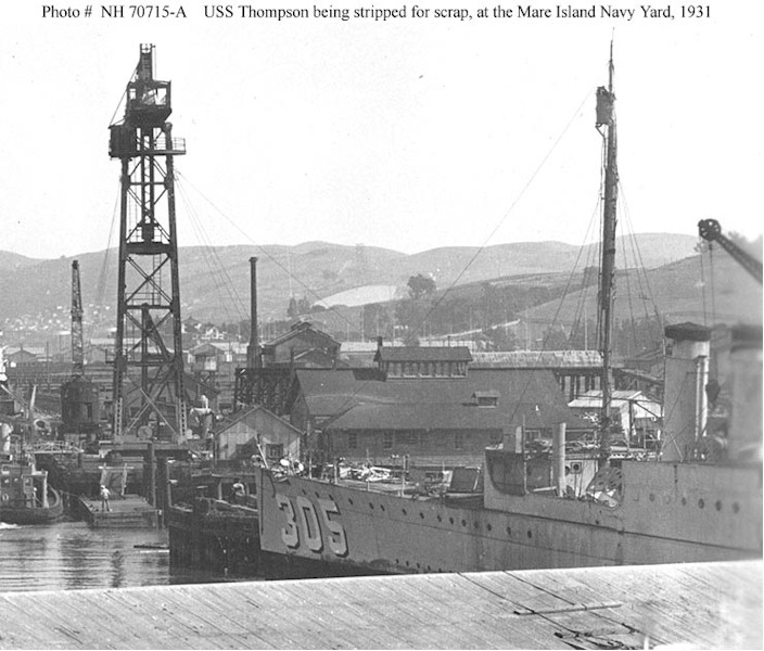 | 102k | Photo #: NH 70715-A, ex-USS Thompson (DD-305) being stripped for scrap, at the Mare Island Navy Yard, California, 1931. This view is cropped from Photo # NH 70715. Courtesy of the Mare Island Naval Shipyard, 1970. U.S. Naval Historical Center Photograph. | Paul Rebold |