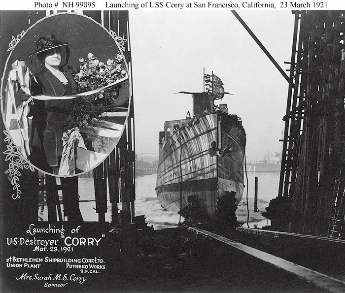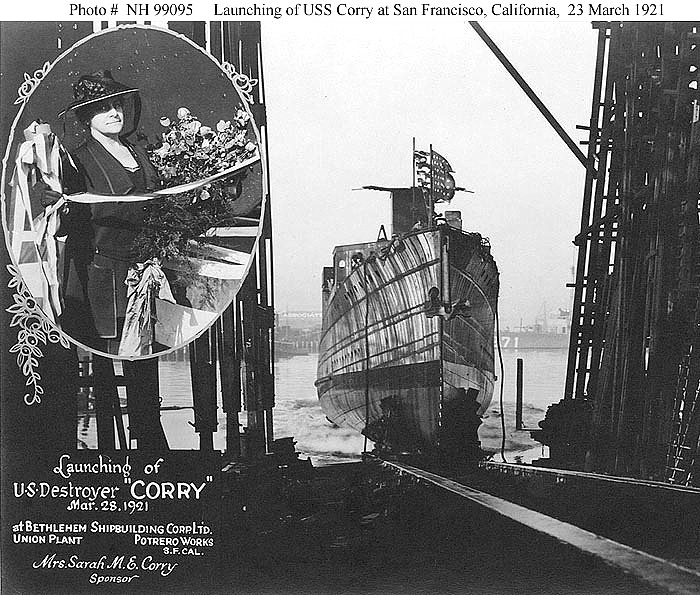 | 136k | USS Corry (DD-334) launching, at the Bethlehem Steel Corporation's Union Plant, Potrero Works, San Francisco, California, 28 March 1921. Small photograph at left shows the ship's Sponsor, Mrs. Sarah M.E. Corry. USS Morris (DD-271) is partially visible in the right background. Collection of the Society of Sponsors of the U.S. Navy. Source: Naval History and Heritage Command, Photo No. NH 99095. | Mike Green |