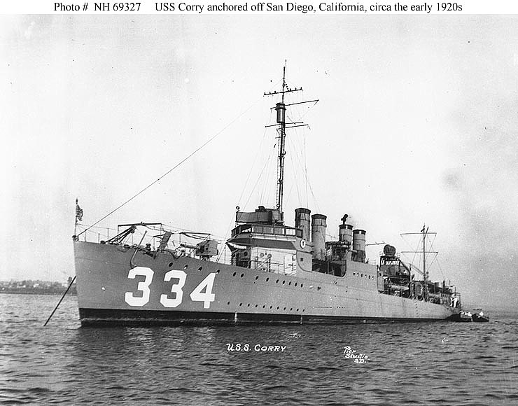 | 123k | USS Corry (DD-334) Underway off Naval Air Station North Island, San Diego, California, circa the middle or later 1920s. U.S. Naval Historical Center Photograph. | Joe Radigan |