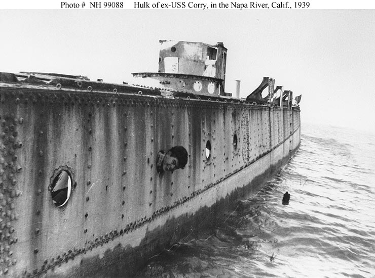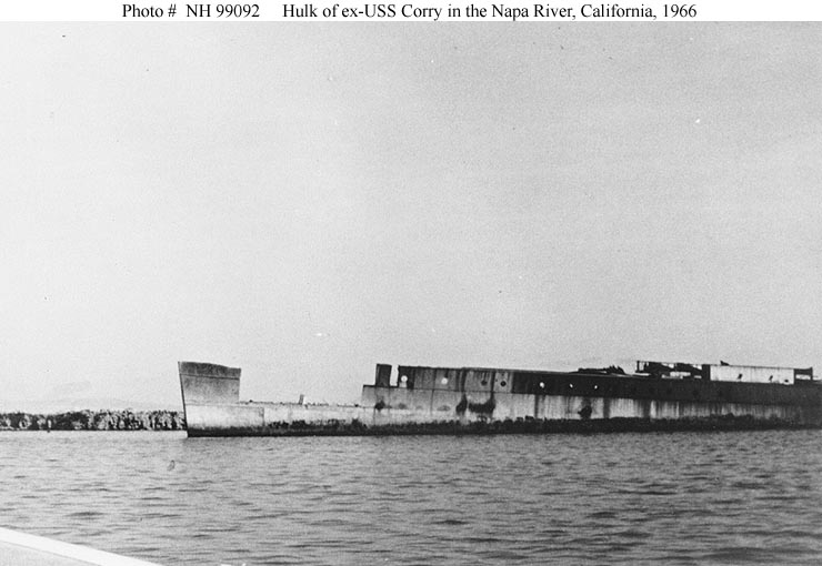 66k | Part of the hull of the USS Corry is located in the Napa River about midway between Vallejo and Napa as of Summer 2004. After being partially dismantled at the Mare Island Navy Yard, ex-USS Corry's remains, consisting of most of her hull and a small portion of her superstructure, were sold. Taken a short distance up the Napa River, about a mile from Mare Island, she was later abandoned where she lay. | Jim Kern, Director, Vallejo Naval and Historical Museum |