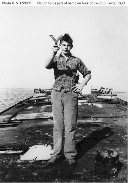 71k | Photo #: NH 99091, ex-USS Corry (DD-334) a young visitor holds the "Y" plate from the ship's name, 1939. Taken on board the ship's partially dismantled hulk, which was sunk in shallow water in the Napa River, California, about a mile from the Mare Island Navy Yard. Courtesy of Jack Howland, 1975. U.S. Naval Historical Center Photograph. | Paul Rebold |