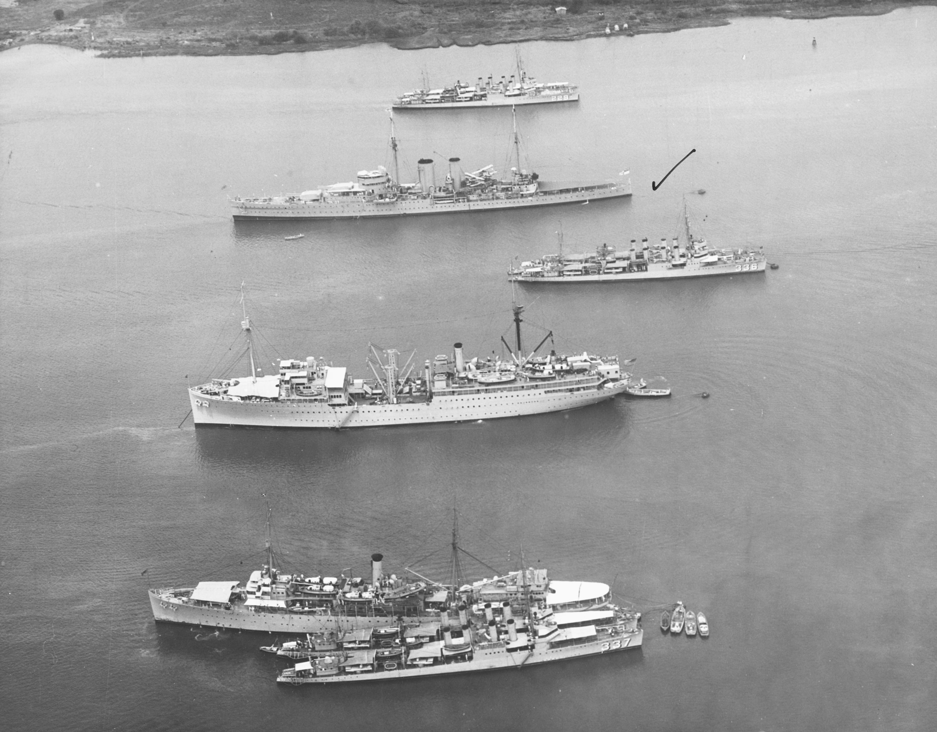 | 839k | British heavy cruiser HMS Exeter (marked by the check) in Balboa Harbor, Panama Canal Zone, 24 April 1934. Several U.S. Navy ships are also present, among them (from the foreground) USS Melville (AD-2) with USS Zane and another destroyer alongside; USS Medusa (AR-1); USS Litchfield (DD-336) and another destroyer; and USS Truxtun (DD-229) and another destroyer. Naval History & Heritage Command photo NH 60813 | Fred Weiss | |
