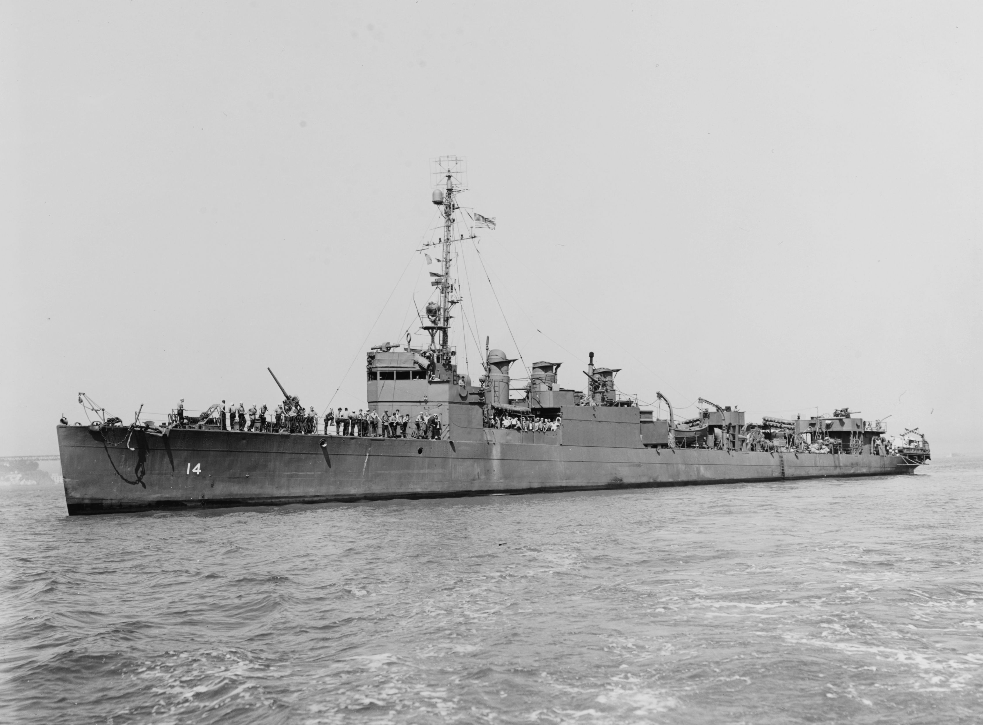 | 589k | USS Zane (DMS-14) off San Francisco, California, 21 September 1943. Zane was underway that day to swing her compasses following overhaul at Mare Island. National Archives photo 19-N-57504. | Fred Weiss | |