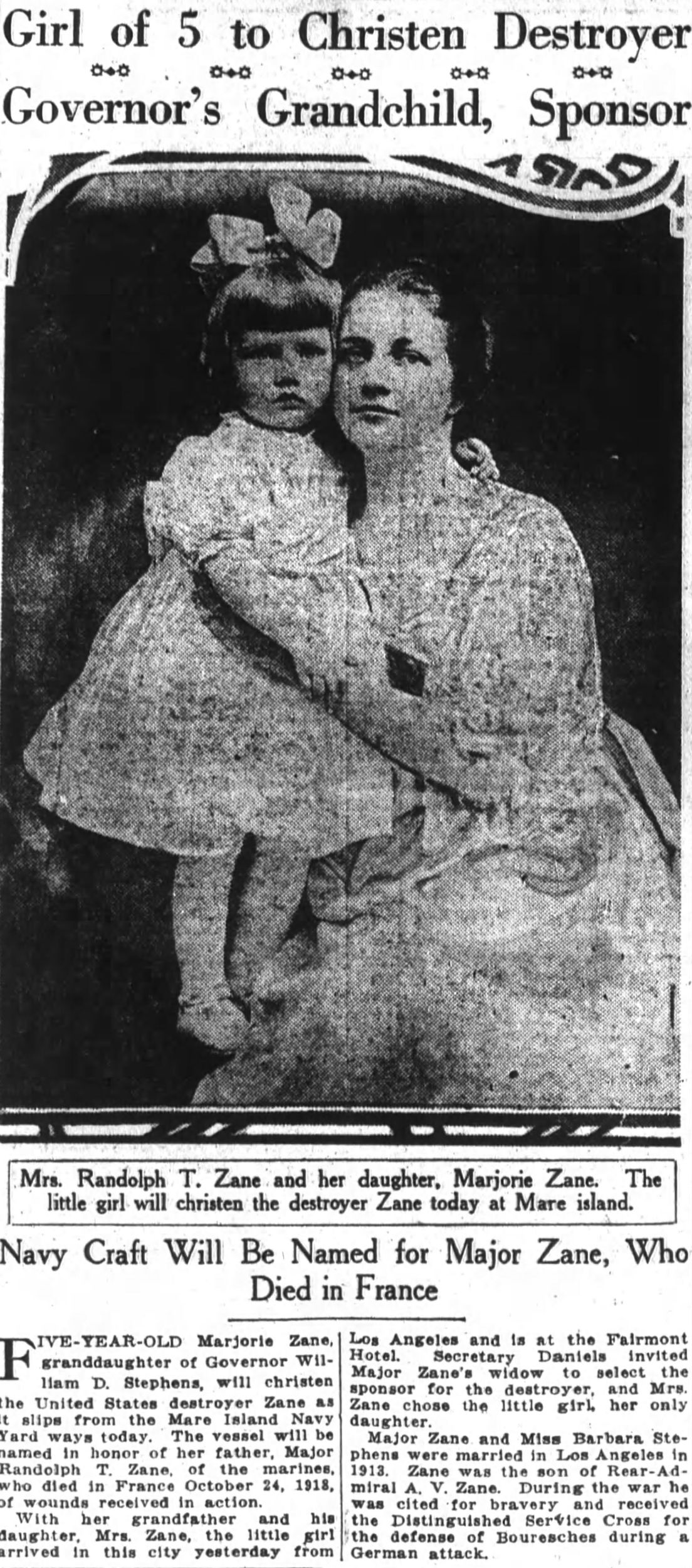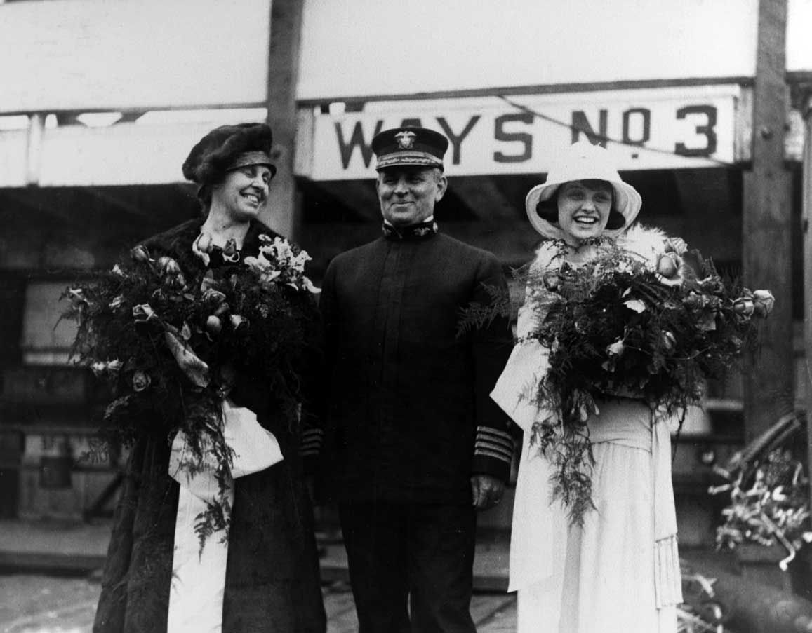 | 116k | Zane's sponsors' party at the destroyer's christening ceremonies, Mare Island Navy Yard, 12 August 1919. The orginal NHHC caption identifies the lady on the right as Major Zane's daughter Marjorie, which seems unlikely, as she would have been five years old at the time. The lady is certainly Barbara Stephens Zane, Major Zane's widow. The woman on the left is probably her aunt, Mrs. John K. Wilson, while the unidentified Navy officer is believed to be Captain Harry George. Naval History & Heritage Command photo NH 70624, courtesy of the Mare Island Naval Shipyard, 1970. U.S. Naval Historical Center Photograph. | Darryl Baker / Bill Gonyo | |