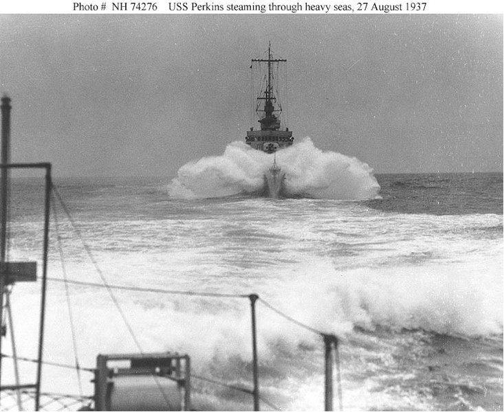 | 109k | Photo #: NH 74276. USS Perkins (DD-377) steaming through heavy seas, 27 August 1937. Photographed from the stern of another destroyer. U.S. Naval Historical Center Photograph. | Tony Cowart |