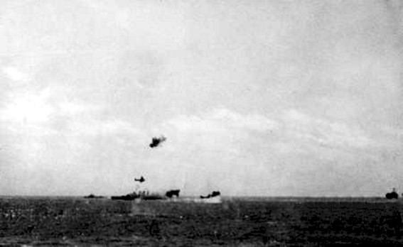 | 166k | Northrup BT-1 bomber (Bureau # 0640), (Bombing Squadron Five's plane number 516) Upside down and sinking after going over the side of USS Yorktown (CV-5) during flight operations in the Pacific, 23 July 1940. USS Perkins (DD-377) is coming up at right to rescue the plane's crew, Lieutenant (Junior Grade) Thomas D. Cummins (Pilot) and Radioman Third Class Donald MacKillop. Official U.S. Navy Photograph, now in the collections of the U.S. National Archives. | Fred Weiss |