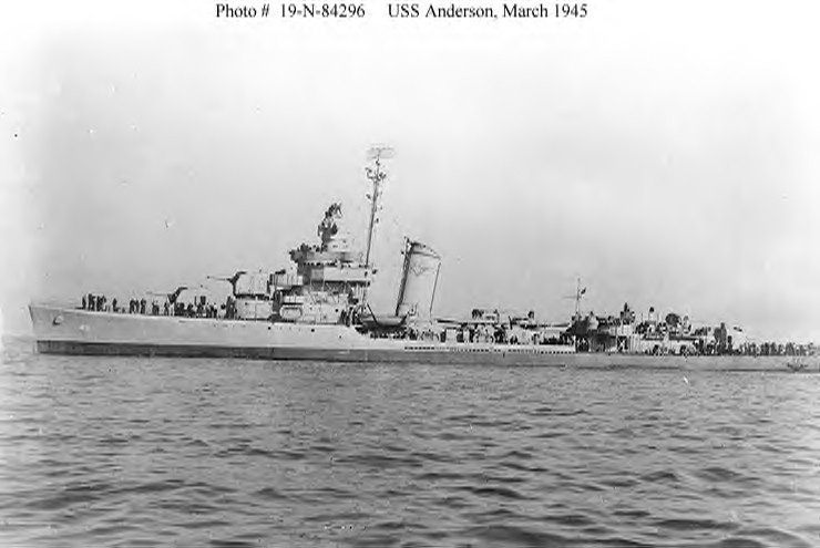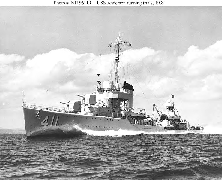 | 123k | USS Anderson (DD-411) Photographed in harbor, possibly at New York, circa 1939-40. Courtesy of Donald M. McPherson, 1969. U.S. Naval Historical Center Photograph. | Fred Weiss |