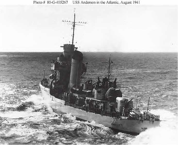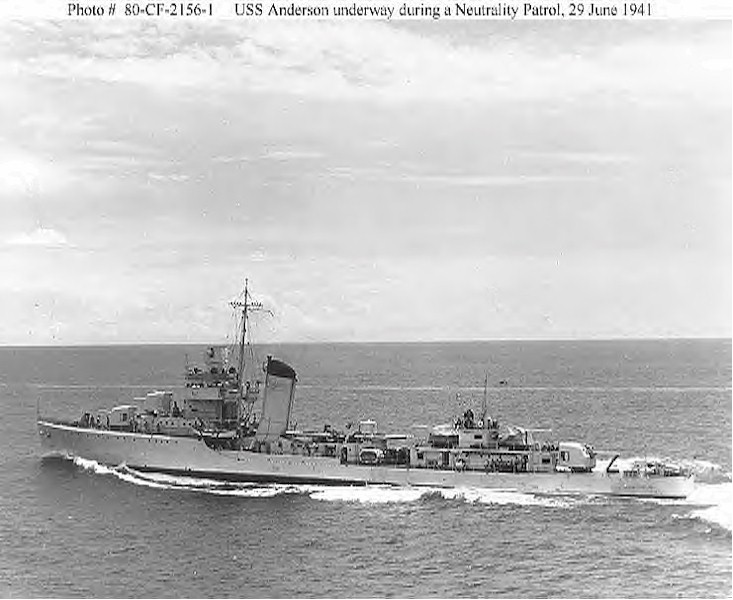 | 89k | USS Anderson (DD-411) underway during a Neutrality Patrol, 29 June 1941. Photographed from USS Wasp (CV-7). Note her unusual paint scheme: overall No. 5 Navy Gray on vertical surfaces, with all identifying markings painted out. This was done as a security measure prior to her transiting the Panama Canal earlier in the Spring. Photograph from Department of the Navy collections in the U.S. National Archives. | Fred Weiss |