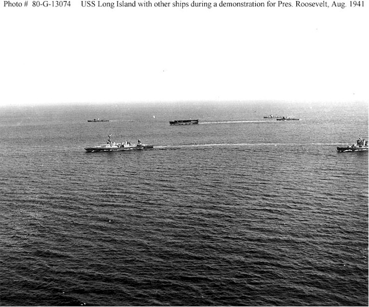| 128k | USS Long Island (AVG-1) (upper center) underway in company with USS Augusta (CA-31), in left front, off Cape Sable, Nova Scotia, on August 1941. Augusta had President Franklin D. Roosevelt embarked to witness Long Island's operations. Among the other ships present are USS Tuscaloosa (CA-37), partially visible at far right, and USS Meredith (DD-434), steaming astern of Long Island. Official U.S. Navy Photograph, now in the collections of the National Archives (# 80-G-13074). | Fabio Peņa | |