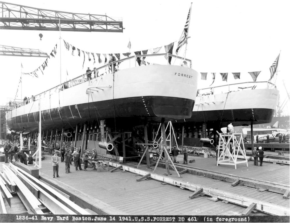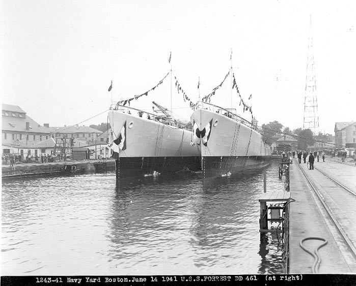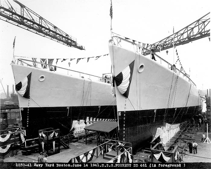 | 84k | Stern view of USS Forrest (DD-461) and USS Fitch (DD-462) in Dry Dock 2 of the Boston Navy Yard immediately after launching, 14 June 1941. (Boston Navy Yard photograph 1219-41, Boston National Historical Park Collection, NPS Cat. No. BOSTS-11126) | Stephen P. Carlson, Boston NHP, Charlestown Navy Yard |