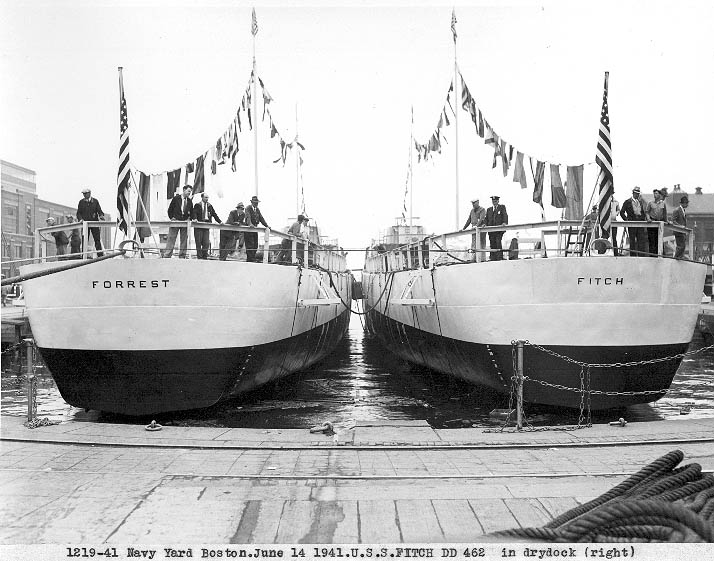 | 70k | Bow view of USS Fitch (DD-462) [left] and USS Forrest (DD-461) in Dry Dock 2 of the Boston Navy Yard immediately after launching, 14 June 1941. (Boston Navy Yard photograph 1243-41, Boston National Historical Park Collection, NPS Cat. No. BOSTS-11148) | Stephen P. Carlson, Boston NHP, Charlestown Navy Yard |