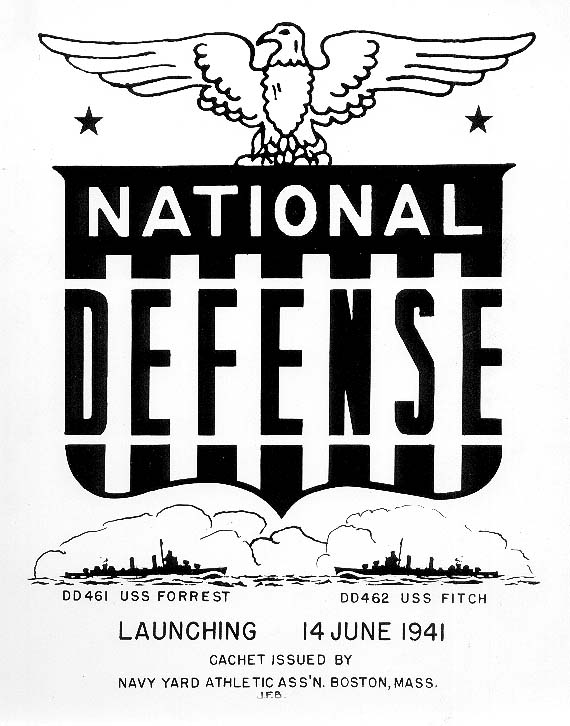 | 102k | Commemorative cachet issued for dual launching of USS Forrest (DD-461) and USS Fitch (DD-462), 14 June 1941. (Boston National Historical Park Collection, NPS Cat. No. BOSTS-11150) | Stephen P. Carlson, Boston NHP, Charlestown Navy Yard |
