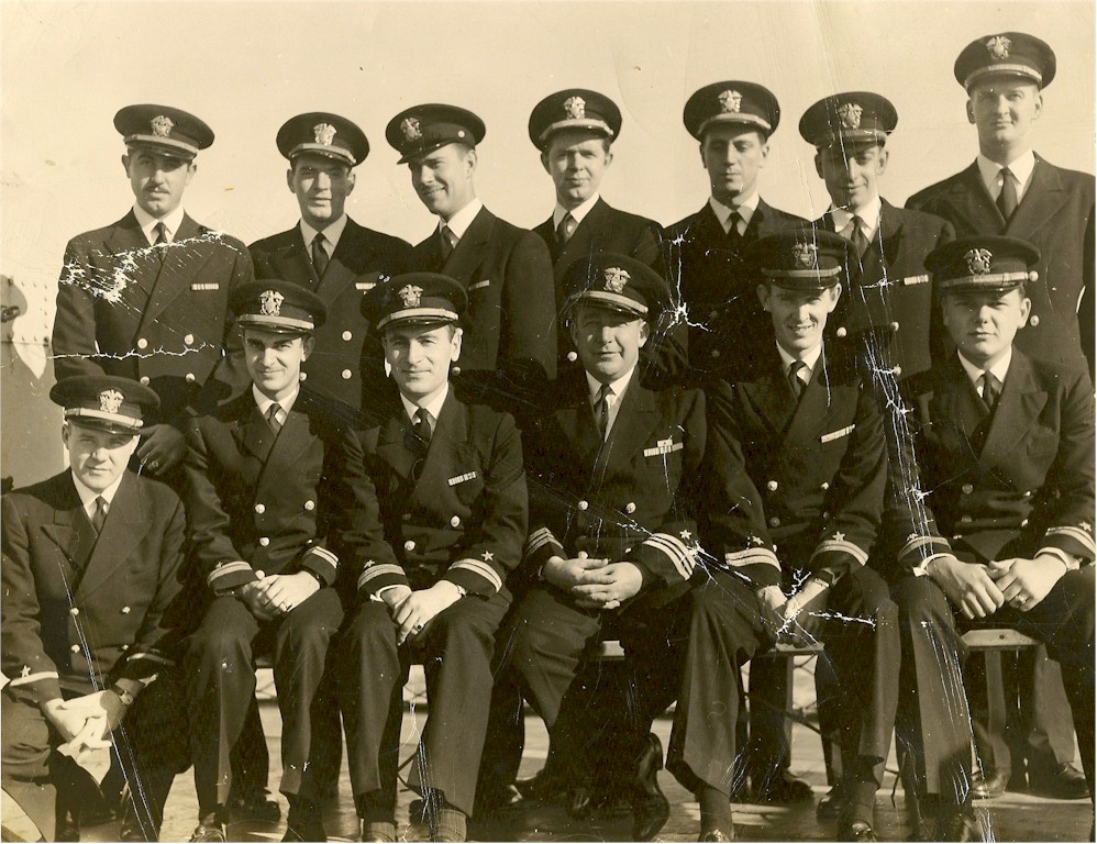 | 223k | Ship's Officers on October 22 1943. Mike's dad, Lloyd D. (Dave) Loggins, is in the top row, first on the left. Second from the right on the top row is LTJG Charles Robert Guthrie grandfather of Charles Guthrie Ethridge. | Michael D. Loggins |