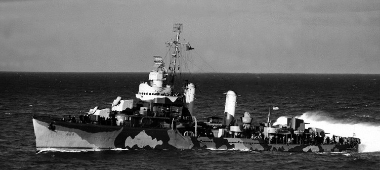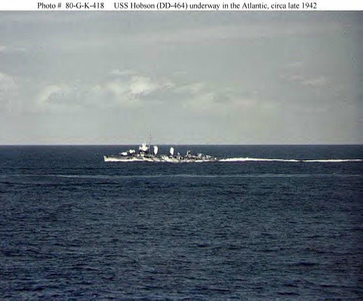 | 122k | USS Hobson (DD-464) off Charleston, South Carolina, on 4 March 1942. She is painted in camouflage Measure 12 (Modified). This photograph has been censored to remove radar antennas atop her foremast and Mark 37 gun director. | Captain Jerry Mason USN |