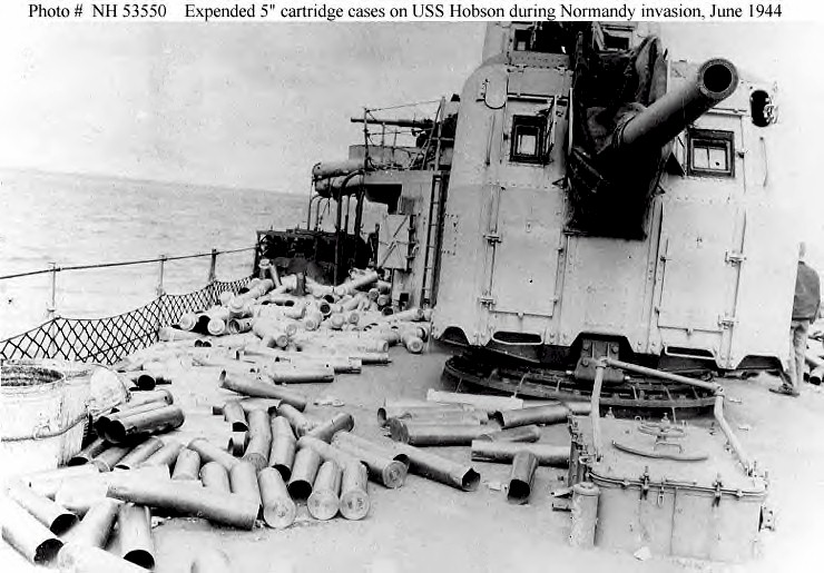 | 116k | Expended cartridge cases and powder tanks from the ship's 5"/38 guns litter the deck, after firing in support of the Normandy invasion off Utah Beach, 6 June 1944. View was taken on the ship's afterdeck, with mount 54 at right. Courtesy of Rear Admiral Kenneth Loveland, USN. U.S. Naval Historical Center Photograph. | Fred Weiss |