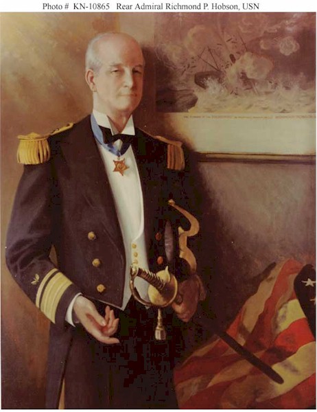 132k | Richmond Pearson Hobson was born 17 August 1870 In Greensboro, Ala., and graduated from the Naval Academy in 1889. After duty in Chicago he underwent additional training and was appointed Assistant Naval Constructor in 1891. Hobson then served at various Navy Yards and facilities, including a tour of duty as instructor at the Naval Academy. In the early days of Spanish-American War, he was with Sampson in New York, and arrived off Santiago 1 June 1898. In order to bottle up Cervera's squadron Hobson took temporary command of collier Merrimac, which he would attempt to sink as an obstruction in the channel. The gallant attempt was made early 3 June under heavy Spanish fire, which disabled the steering gear of the collier. Hobson did sink Merrimac, but was unable to place her in the shallowest part of the channel. With his intrepid crew of six, he was picked up by Admiral Cervera himself, and treated quite chivalrously for his gallant expedition. Hobson was advanced 10 numbers in grade after the war and later, in 1933, awarded the Medal of Honor for his heroic attempt to block the channel. After the Spanish-American War he worked on the repairing and refitting of captured Spanish cruisers at Cavite and at various shore stations of the Navy. Resigning in 1903, Hobson remained a staunch supporter of the Navy and during his subsequent career as a Congressman from Alabama, 1905-15, was a firm advocate of naval expansion. In 1934, by special act of Congress, he was advanced to Naval Constructor with a rank of Rear Admiral, and placed on the retired list. Rear Admiral Hobson died 16 March 1937 in New York City. Photo #: KN-10865, Rear Admiral Richmond P. Hobson, USN (Construction Corps, Retired), (1870-1937) oil on canvas, 52" x 40", by Olive Bigelow, dated 1937. He is depicted standing before an artwork of that event. Painting in the U.S. Naval Academy Museum Collection. Gift of Herbert Pell, 1949. Official U.S. Navy Photograph. Second photo is from On 29 April 1933, for his "extraordinary heroism" during the the Spanish-American War, Richmond Pearson Hobson was awarded the Medal of Honor by President Franklin D. Roosevelt.