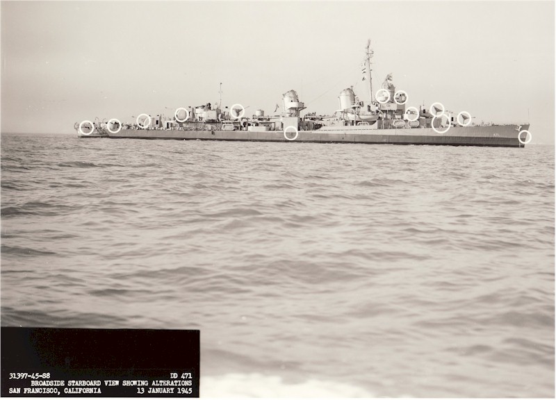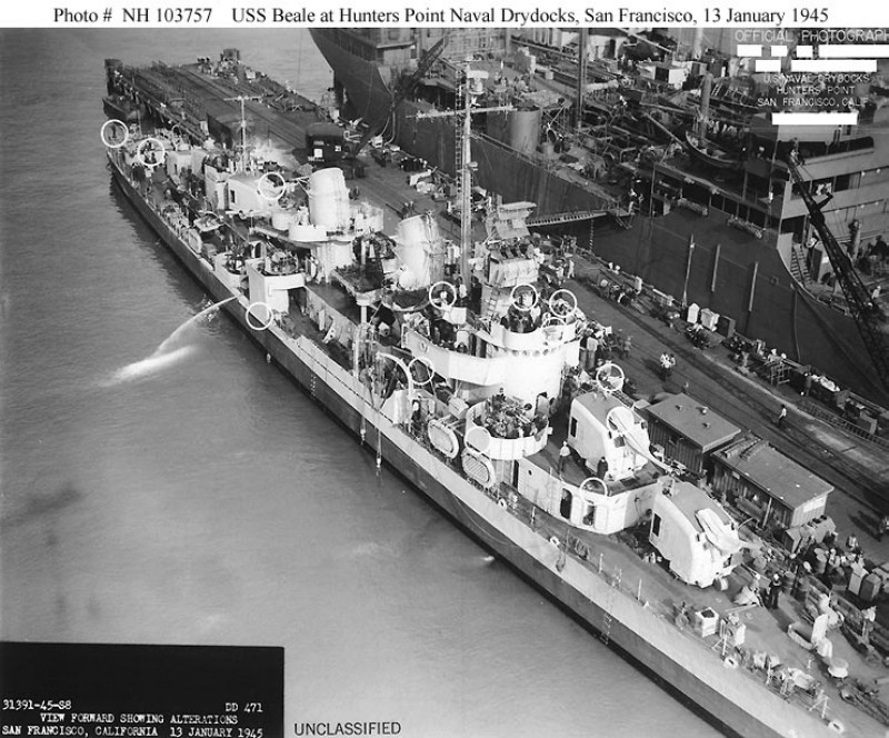 | 164k | USS Beale (DD-471), a plan view forward taken at the Hunters Point Naval Drydocks, San Francisco, California, 13 January 1945. White outlines mark recent alterations to the ship. Official U.S. Navy Photograph, from the collections of the Naval Historical Centre Photo # NH 103757. | Robert Hurst |