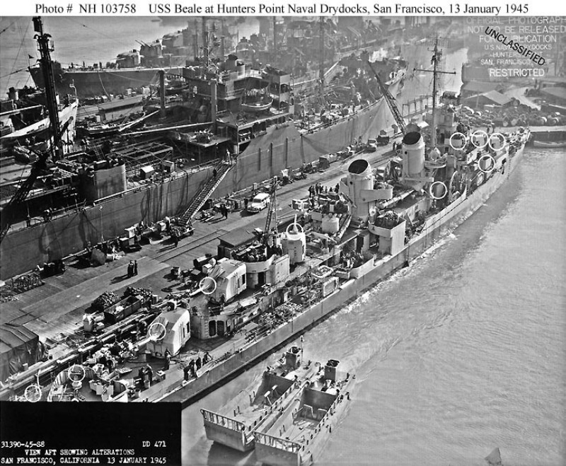 | 86k | The USS Beale (DD-471) 13 January 1945 at San Francisco after her upgrade to the five twin 40mm gun mounts and seven 20mm standard for Fletcher class destroyers. | Rick E. Davis |