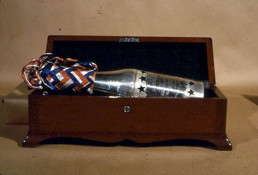 93k | The christening bottle cover from the launch of USS Hudson (DD-475) in its original presentation box is displayed in the “Serving the Naval Fleet” exhibit in the Charlestown Navy Yard Visitor Center of Boston National Historical Park. (National Park Service photograph by Brooke A. Childrey, Boston National Historical Park Collection) | Stephen P. Carlson, Boston NHP, Charlestown Navy Yard |