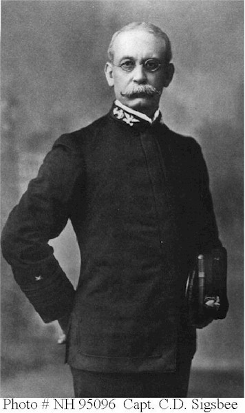 | 50k | Charles D. Sigsbee, born on 16 January 1845 at Albany, N. Y., was appointed acting midshipman on 16 July 1862. He was commissioned rear admiral on 10 August 1903. Sigsbee served aboard Monongahela, Wyoming, and Shenandoah from 1863 to 1869 when he was assigned to duty at the Naval Academy and, in 1871, to the Hydrographic Office. He was in command of various ships from 1873 to 1891 and served as a hydrographer in the Bureau of Navigation from 1893 to 1897. Sigsbee commanded St. Paul in 1898 and Texas until 1900. He assumed command of the South Atlantic Squadron in 1904 and the Second Division, North Atlantic Squadron in 1905. Admiral Sigsbee retired from the Navy in 1907. Photo #: NH 95096. Captain Charles D. Sigsbee, U.S. Navy, Commanding Officer of USS Maine when she was lost on 15 February 1898. Photograph published in Bohemia, 1904, by the International League of Press Clubs, opposite page 26. Courtesy of Larry Franklin, 1983. U.S. Naval Historical Center Photograph. | Bill Gonyo | |