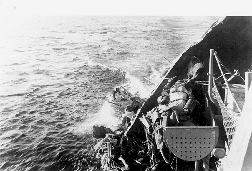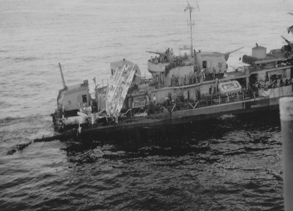 | 188k | 14 April 1945 after being hit by a kamikaze off Okinawa. View is from USS Dashiell while approaching to render assistance, remove ComDesDiv50 Hop Parish, and rig a tow. | CDR Ray Davis/Ed Zajkowski | |