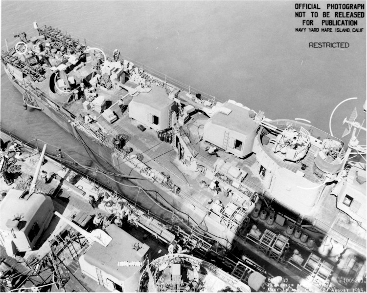 | 158k | Aft plan view of USS Isherwood (DD 520) at Mare Island on 21 Aug 1945 with USS Stephen Potter (DD 538) inboard. Isherwood was in overhaul at the yard from 3 June until 22 August 1945. | Darryl Baker | |