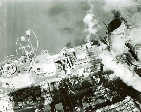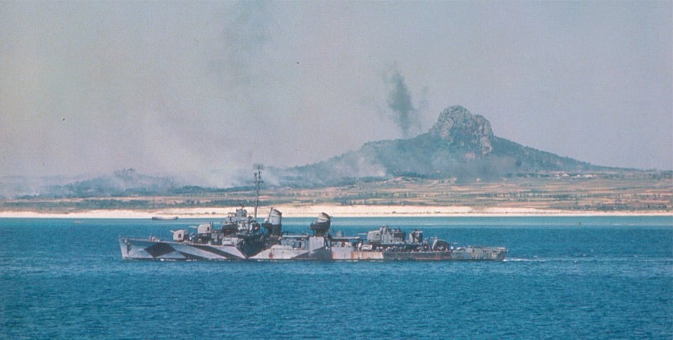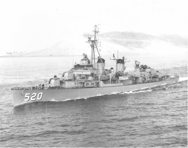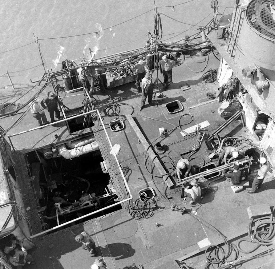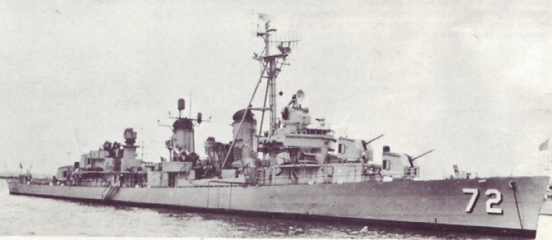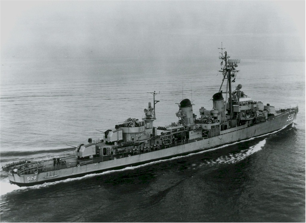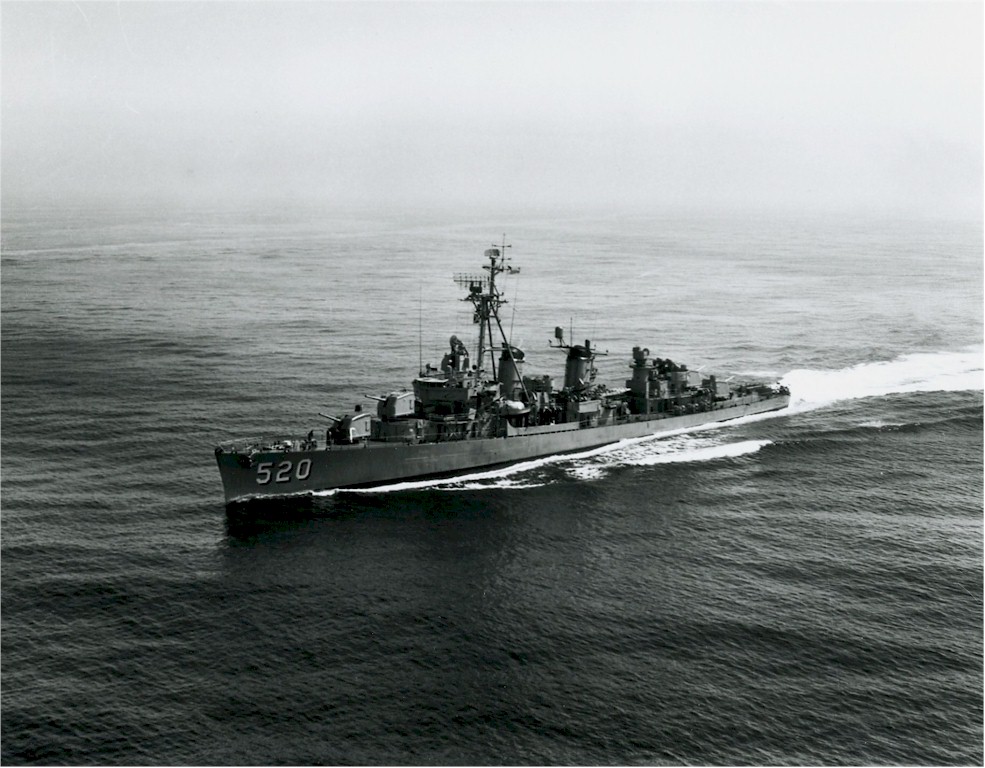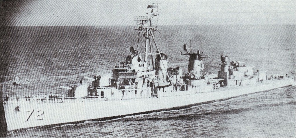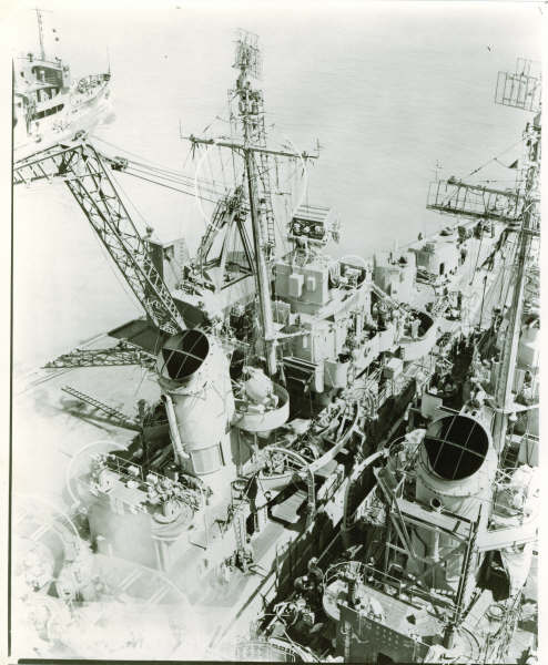 Bows of Shaw (DD-373) and Haynsworth (DD-700) are visible at left. National Archives 19LCM/dd592 folder. | John Chiquoine | |