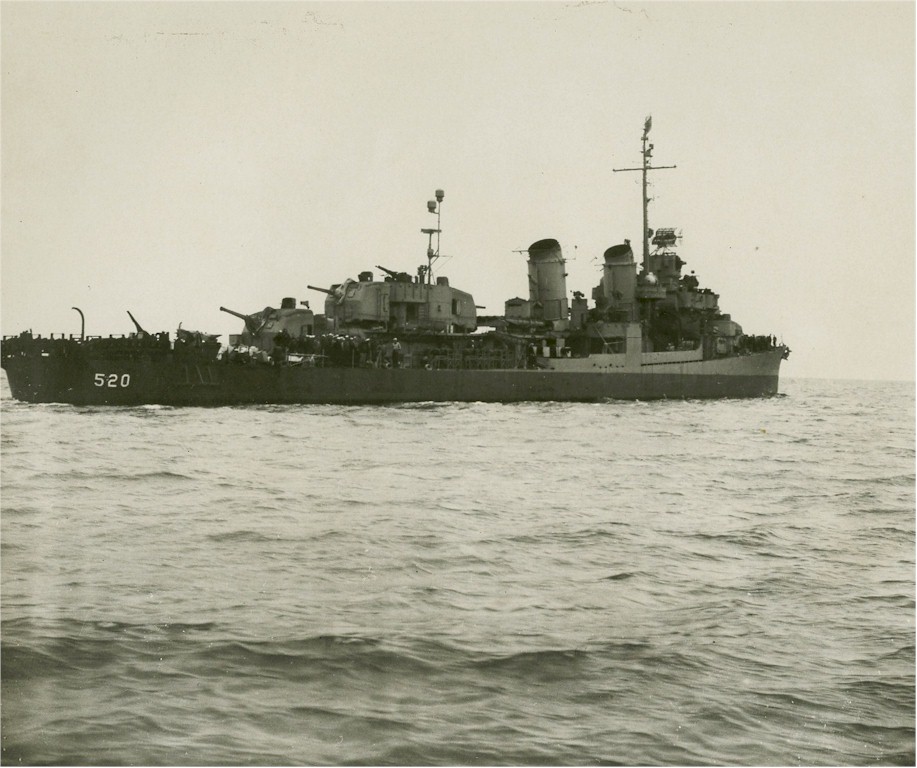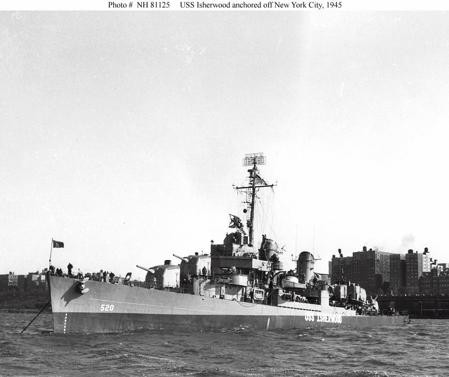 | 121k | USS Isherwood (DD-520) anchored off New York City, probably at the time of the 27 October 1945 Victory Fleet Review. Note the ship's name painted on her side. Donation of Lieutenant Gustave J. Freret, USN (Retired), 1972. U.S. Naval History and Heritage Command Photograph. Photo #: NH 81125. | Robert Hurst | |