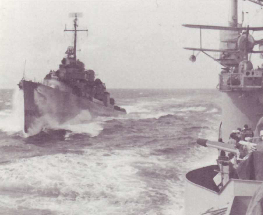 | 93k | USS Isherwood (DD-520) underway in heavy weather as she comes alongside the heavy cruiser USS Tuscaloosa (CA-37) in August 1943. National Archives and Records Administration. Photo # 80-G-79429. | Robert Hurst | |