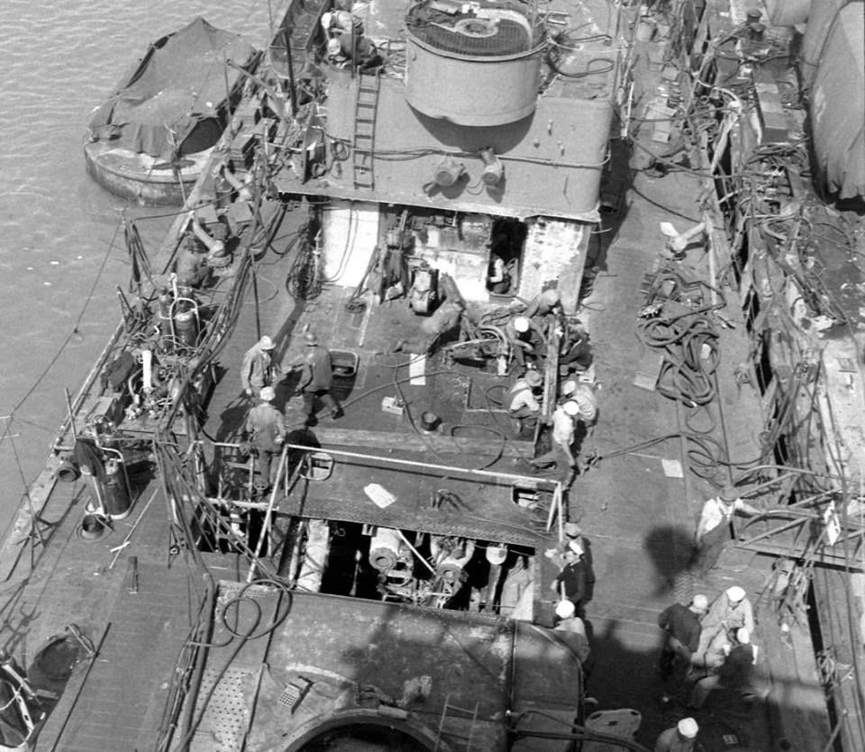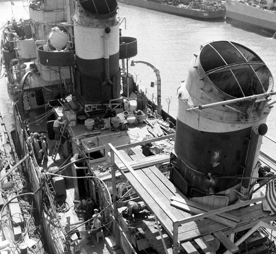 ![]() USS Isherwood being repaired after kamikaze damage at Mare Island Navy Yard, 23-26 June 1945. LIFE Magazine archives, original photographer Thomas McAvoy. Used for educational and non-commercial purposes. | John Chiquoine | |||
