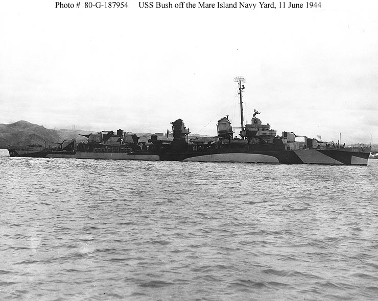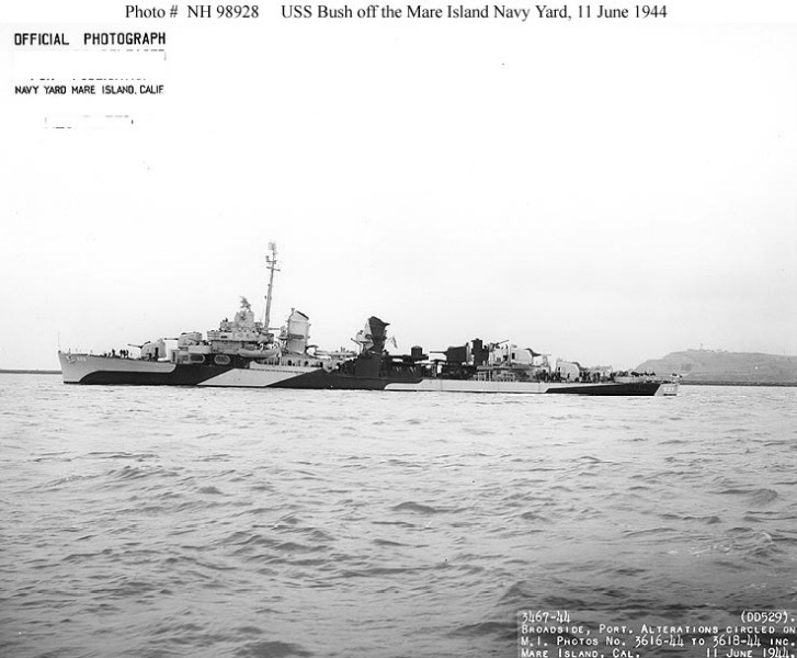 | 85k | Photo #: 80-G-187954. USS Bush (DD-529) off the Mare Island Navy Yard, California, 11 June 1944. Her camouflage is Measure 32, Design 1d. Official U.S. Navy Photograph, now in the collections of the National Archives. | Tony Cowart | |
