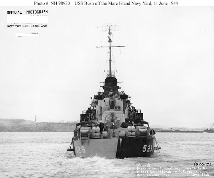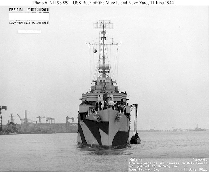 | 162k | USS Bush (DD 529) off Mare Island on June 11, 1944. Photo from the collection of the Vallejo Naval and Historical Museum. | Darryl Baker | |