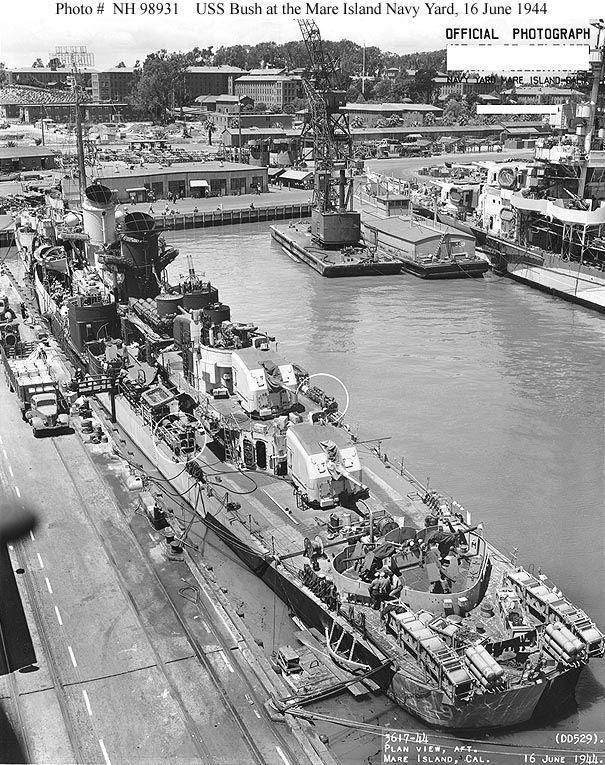 | 162k | Photo #: NH 98931. USS Bush (DD-529) plan view aft, taken from a pierside crane at the Mare Island Navy Yard, California, 16 June 1944. Official U.S. Navy Photograph, from the collections of the Naval Historical Center. | Tony Cowart | |