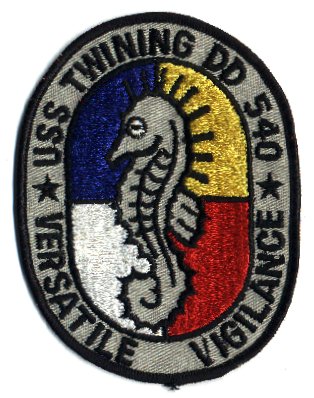 | 142k | The mountain on the left is Mount Tamalpais in Marin County on San Francisco Bay, San Pablo Bay to be precise. The green hump of land is on the approach to the Port of Richmond. The Twining is steaming west. In the 1960s she was the USNR ship stationed at Treasure Island. This photo was most likely taken at that time. | Tommy Trampp/Bert Ricci | |