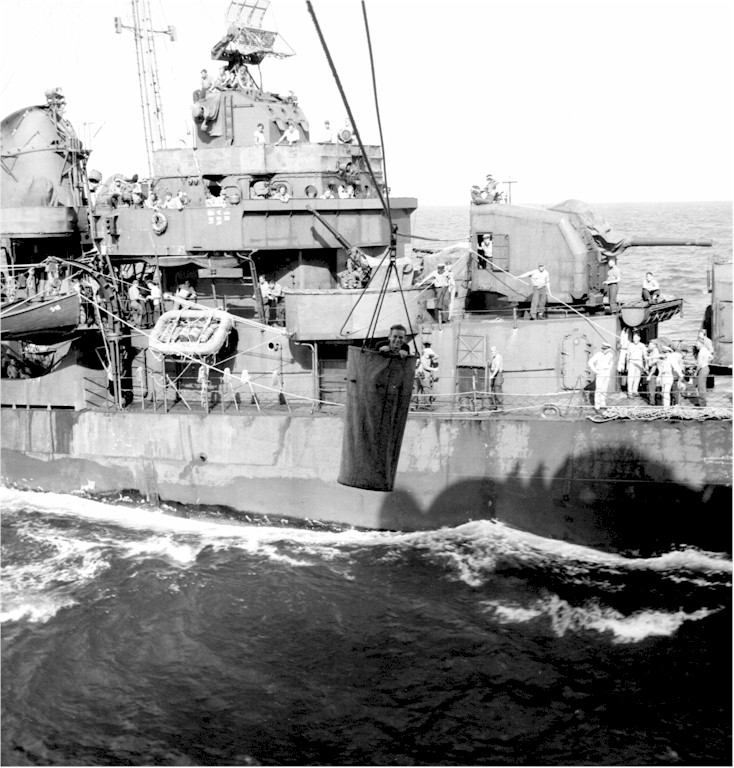 | 155k | USS Brown (DD-546) photographed somewhere in the Pacific during late 1944. The man in the bucket is U.S. Navy combat cameraman PHoM 2/C Paul D. Guttman, who was being transferred from the Brown to the aircraft carrier USS Hornet (CV-12). Photo from the collection of Paul D. Guttman. | Robert Guttman | |