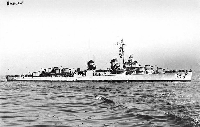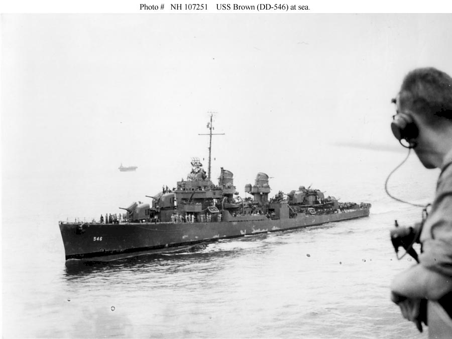 | 73k | Brown (DD-546) underway at sea in February 1944, while maneuvering close to another ship. Note the escort aircraft carrier(CVE) in the left-center distance. Photographed by Commander Donald B. Ingerslew, USN. Official U.S. Navy Photograph, from the collections of the Naval History and Heritage Command. Photo #: NH 107251. | Robert Hurst | |