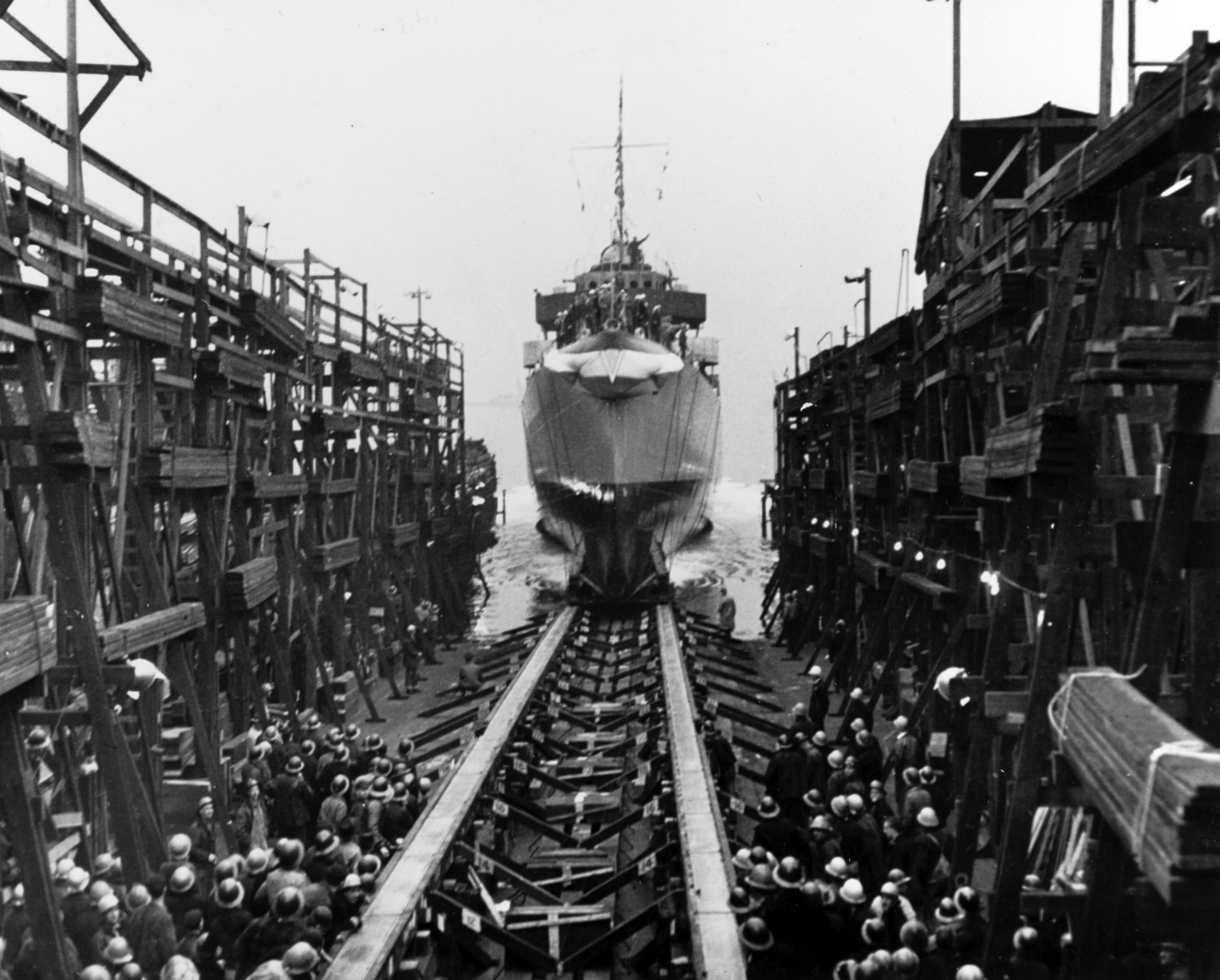 495k | USS Johnston (DD-557) sliding down the building ways at the Seattle-Tacoma Shipbuilding Corporation shipyard, Seattle, Washington, 25 March 1943.