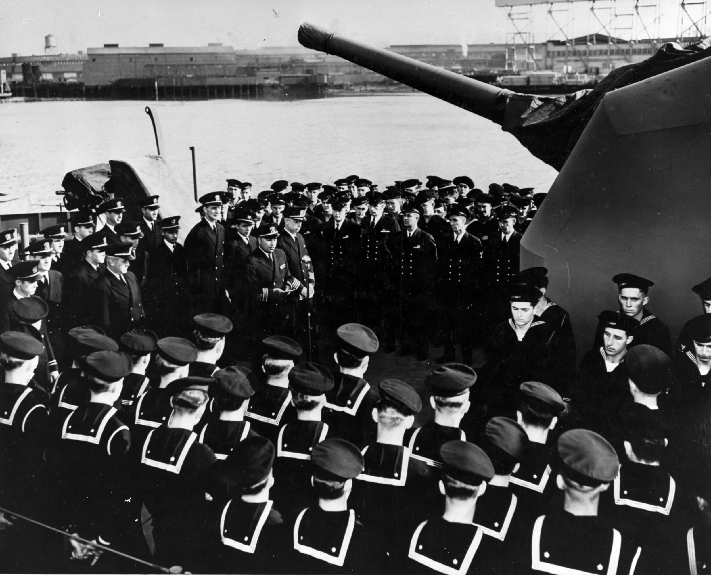 500k | USS Johnston (DD-557) commissioning ceremonies on the ship's fantail, at Seattle, Washington, 27 October 1943. Lt. Commander Ernest E. Evans, USN, her Commanding Officer, is speaking in the left center. Naval History & Heritage Command photo NH 63368 | Bill Gonyo |