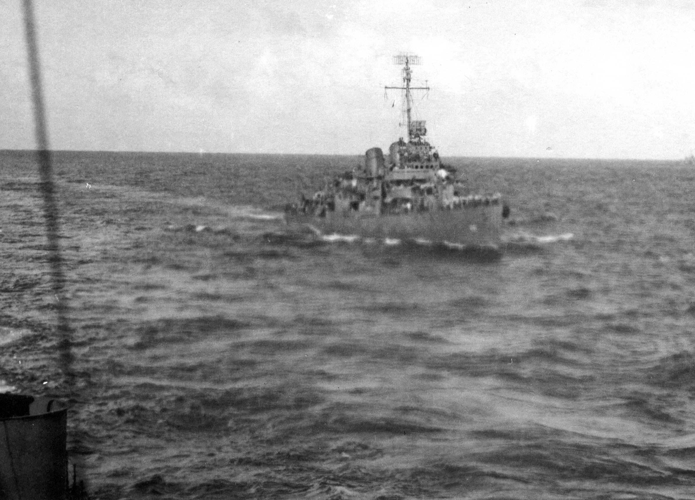 243k | USS Johnston (DD-557) coming alongside USS Millicoma (AO-73) to fuel, 12 September 1944. They were part of the train force operating as TU 30.8.8, supporting heavy units in the Peleliu operation. Photo made from USS Saginaw Bay (CVE-82), in unrep to Millicoma's port. National Archives photo 80-G-334967 | John Chiquoine and Dave Schroeder |