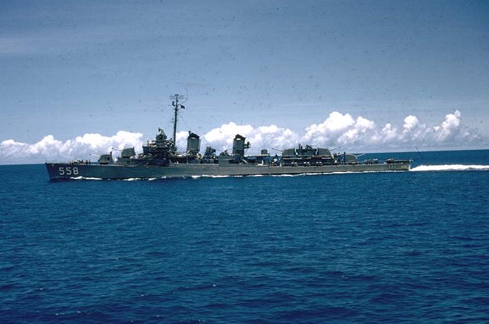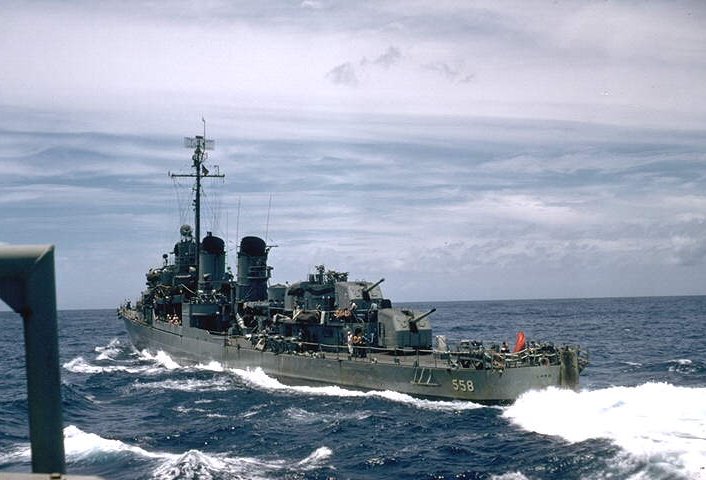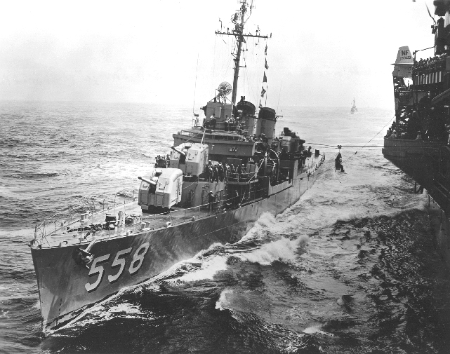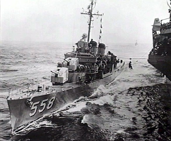 | 93k | Fine off the port bow view of the USS Lawes (DD-558), as she carries off a jack-stay transfer to an unidentified U.S. aircraft carrier. The photo is taken in the early 1950s, and the Lawes still carries a mixture of WW2 and post-WW2 equipment. Post-war modifications include an anti-submarine hedgehog mortar, Mark 25 Fire Control Radar, and SPS-10 surface search radar. Her #3 5”/38 gun mount has not been removed, but she still carries 40mm Bofors AA guns and is still equipped with SC-4 radar at the mast head. Source: Australian War Museum, Photo No. 302651. | Mike Green |