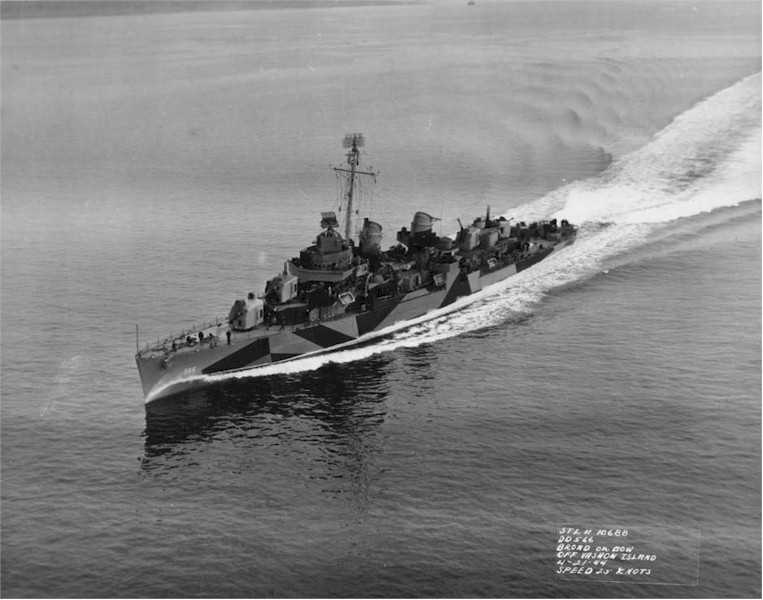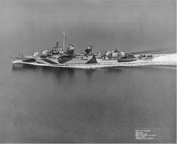 | 97k | Underway off Vashon Island, which is just out of the channel from Bremerton and Puget Sound Navy Yard, 21 April 1944. On this day, Stoddard received her intitial outfit of torpedoes and depth charges, as well as visiting the degaussing range. The ship is painted in camouflage Measure 31, Design 16d. | Tracy White |