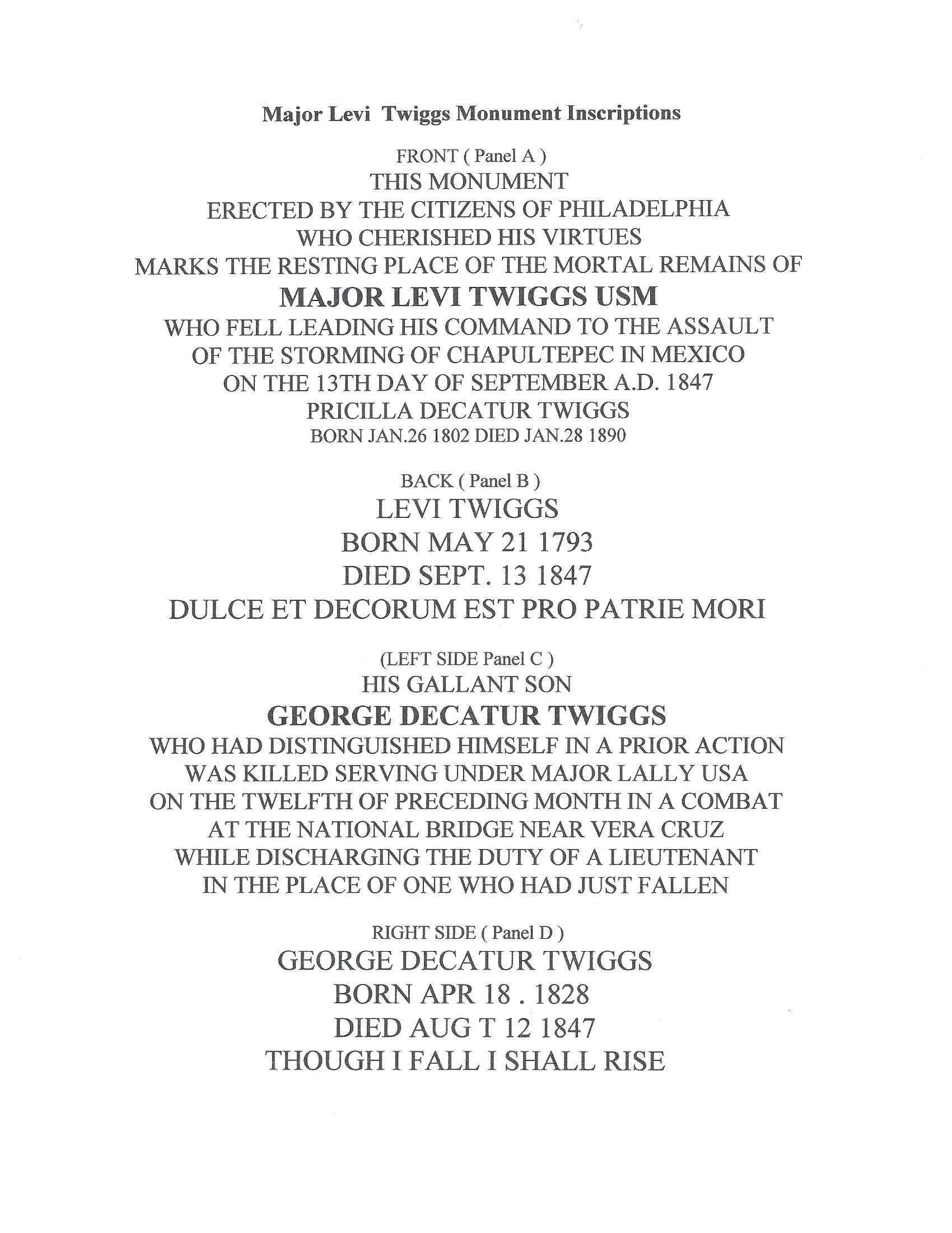 300k | Inscription on Levi Twiggs' grave memorial in Laurel Hill Cemetery, Philadelphia, PA | Anonymous donor in memory of Twiggs and her crew | |