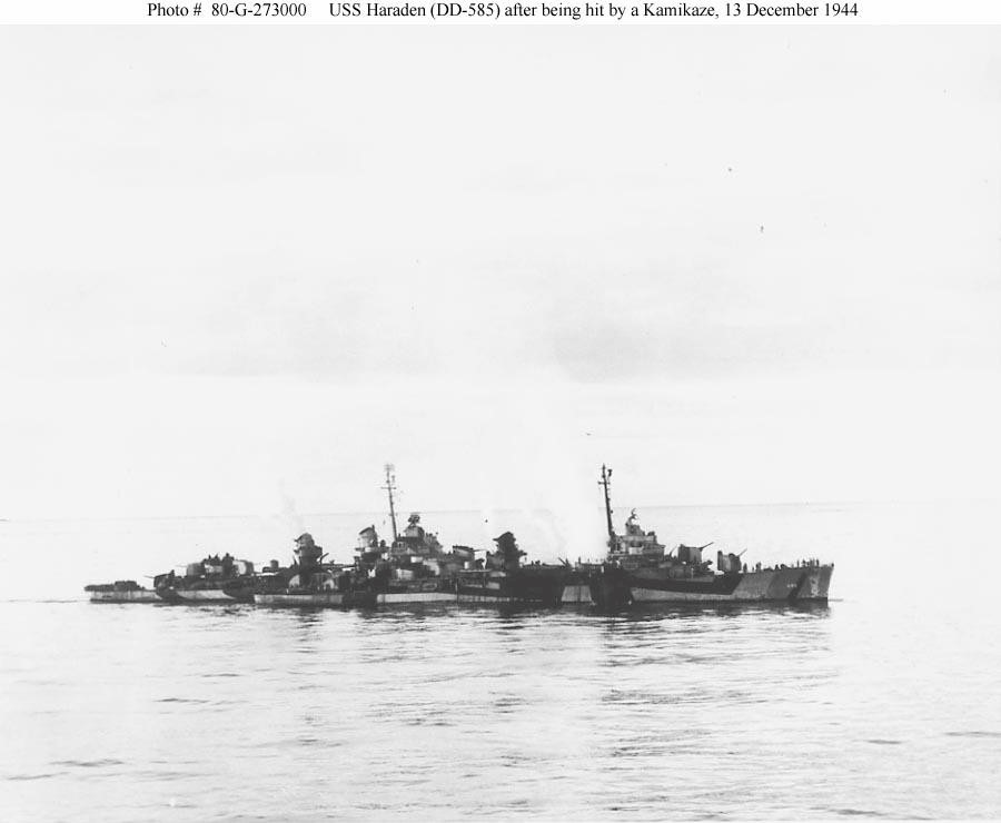 62k | USS Haraden (DD-585) after being hit by a Kamikaze in the Sulu Sea, 13 December 1944, while enroute to the Mindoro invasion. USS Twiggs (DD-591) is alongside rendering assistance. Photographed from USS Kadashan Bay (CVE-76). Haraden is painted in Camouflage Measure 31, Design 3D (for drawings of this design, see Photo #s 80-G-158591 and 80-G-158592). Twiggs is wearing Camouflage Measure 32, Design 6D (see Photo #s 80-G-162024 and 80-G-162025). National Archives photo 80-G-273000 | Robert Hurst | |
