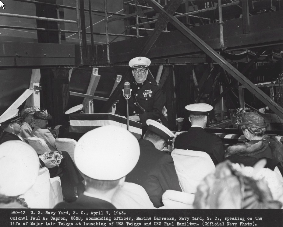 152k | Charleston Navy Yard, 07 April 1943. Colonel Paul A. Capron, USMC, commanding officer, Marine Barracks, Navy Yard, Charleston, SC, speaking on the life of Major Levi Twiggs at the launching of USS Twiggs and USS Paul Hamilton (DD-590). | Mike Mohl | |